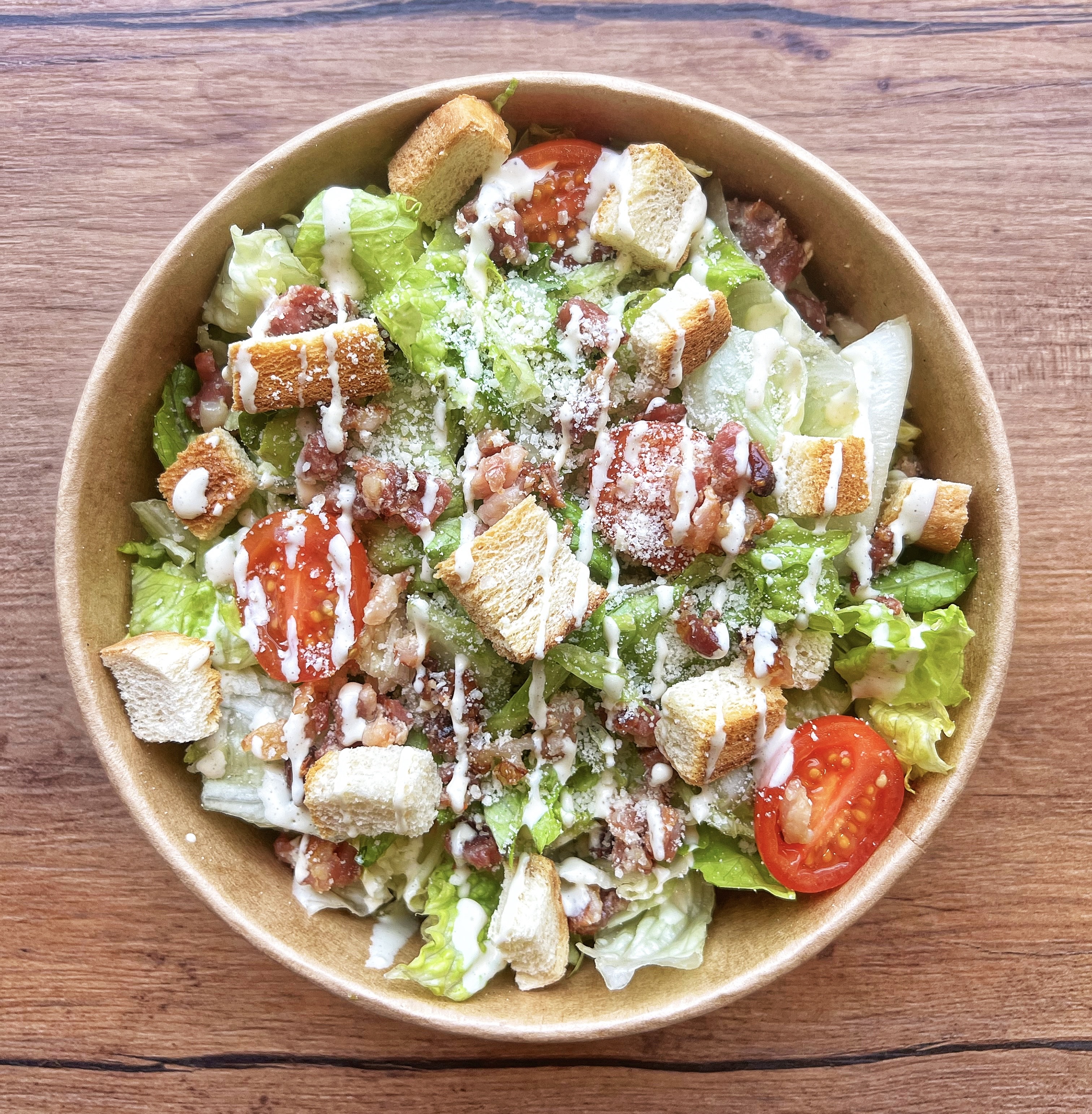 Mix salátů, slanina, parmezán, cherry rajče, krutón.