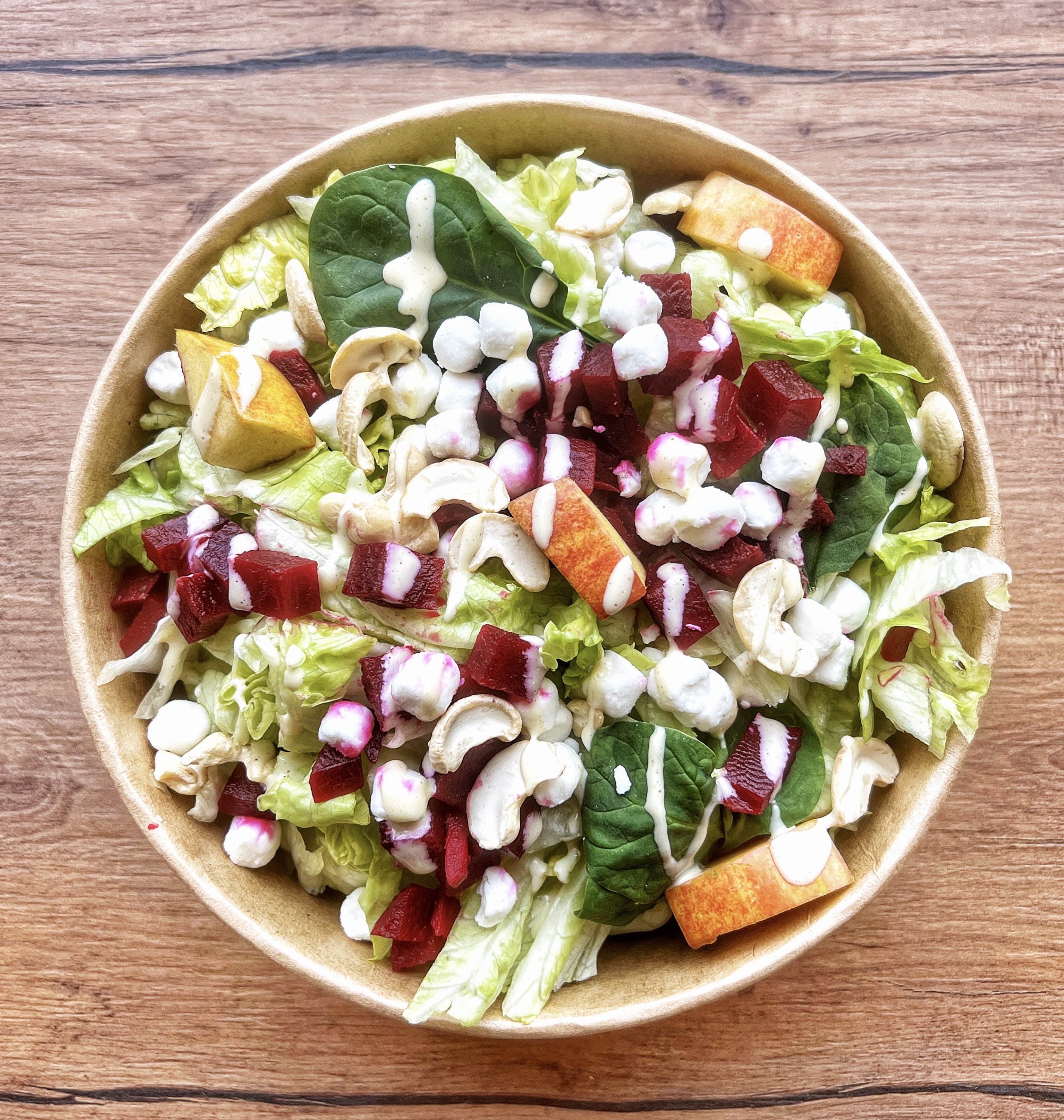 Mix salátů, baby špenát, červená řepa, kozí sýr, jablko, kěsu